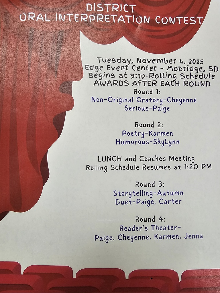 District Oral Interp Contest. Tuesday, November 4 in Mobridge.